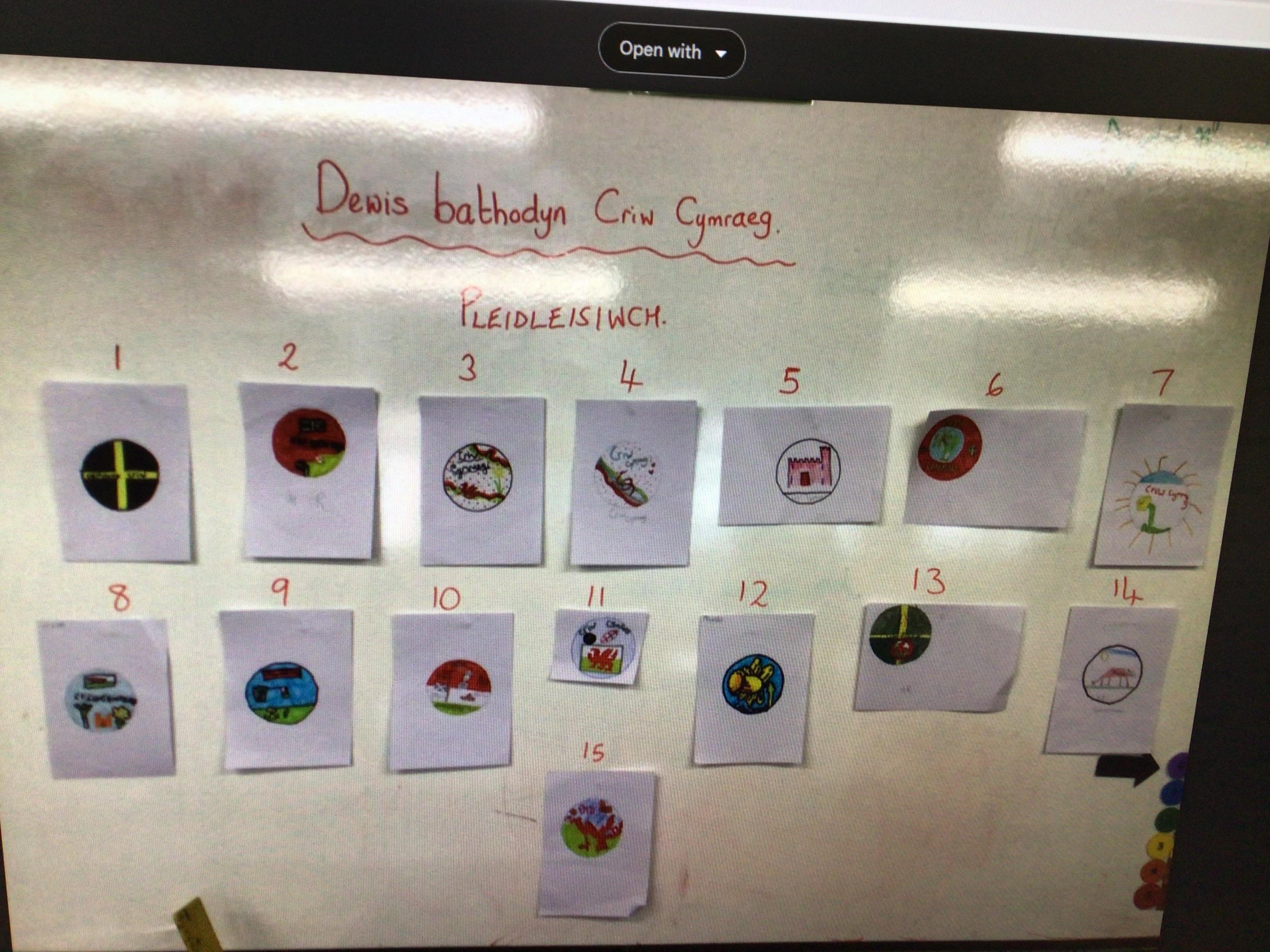 We designed a badge for Criw Cymraeg members to wear around school. We each designed a badge and then the members of the Criw held a vote to decide which one they liked best.