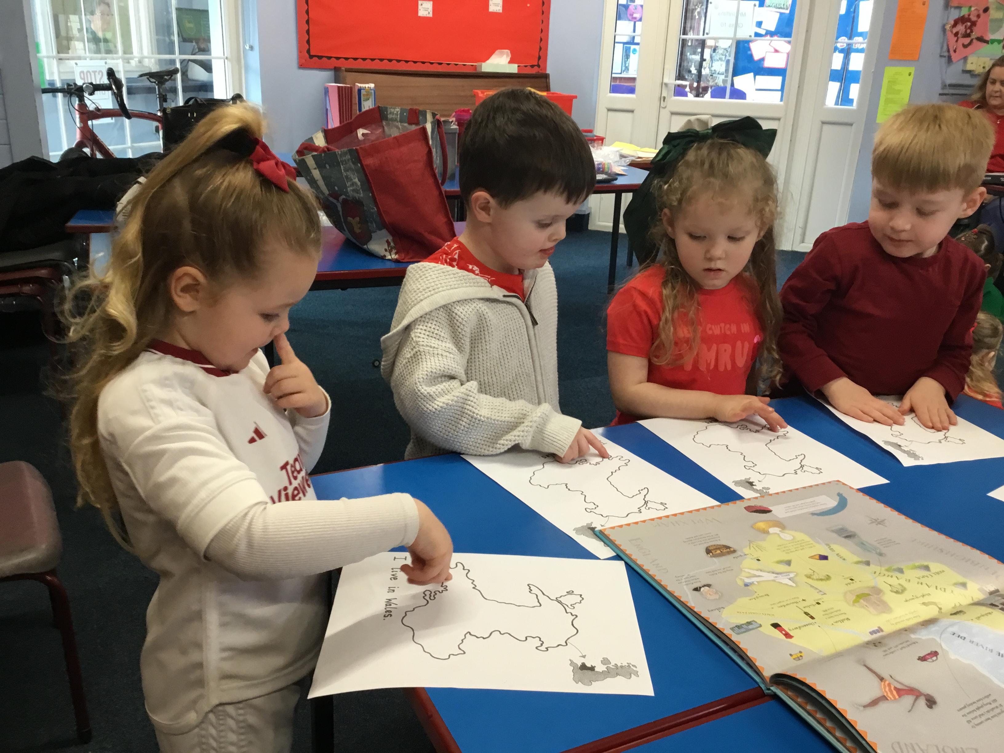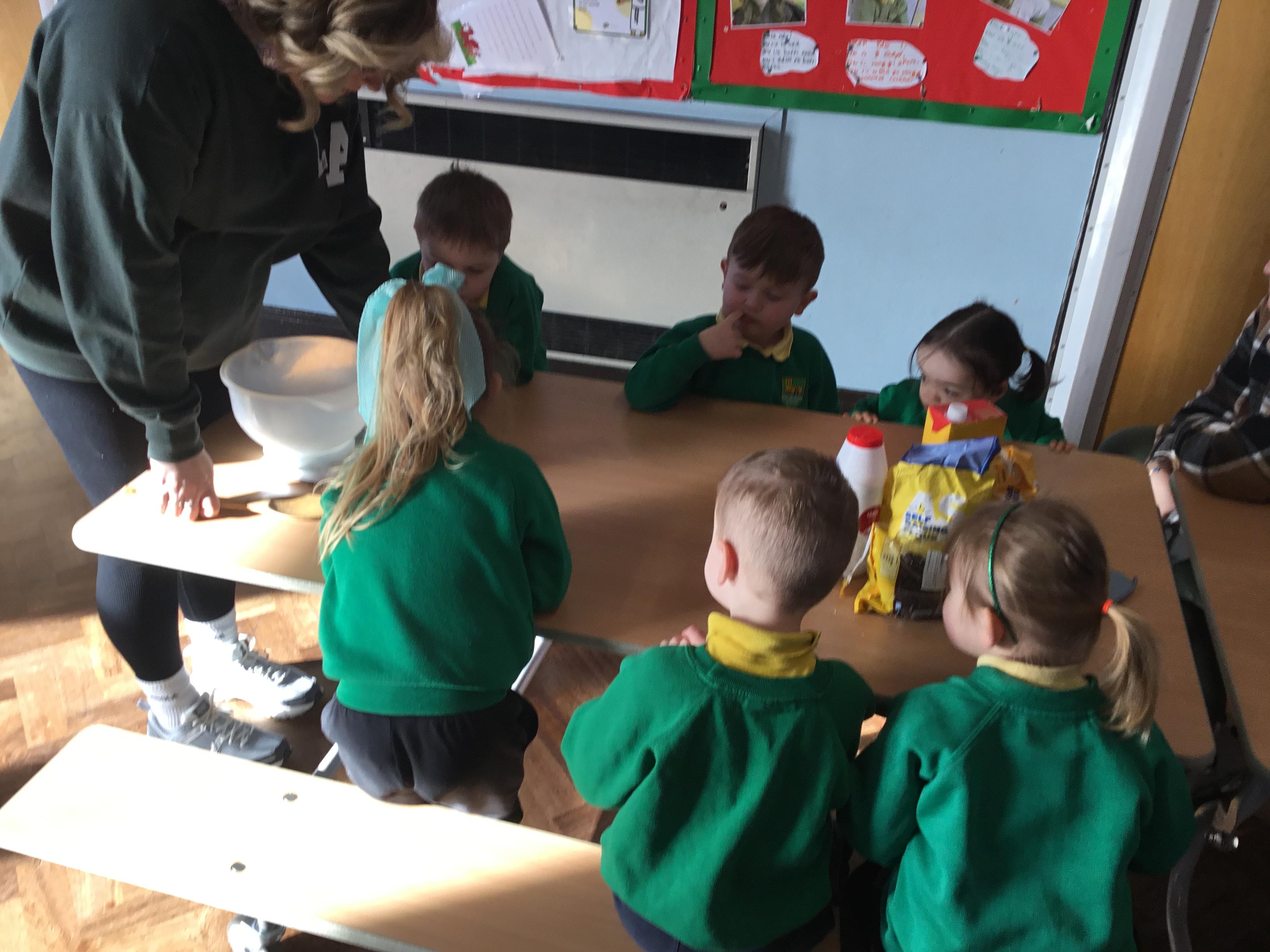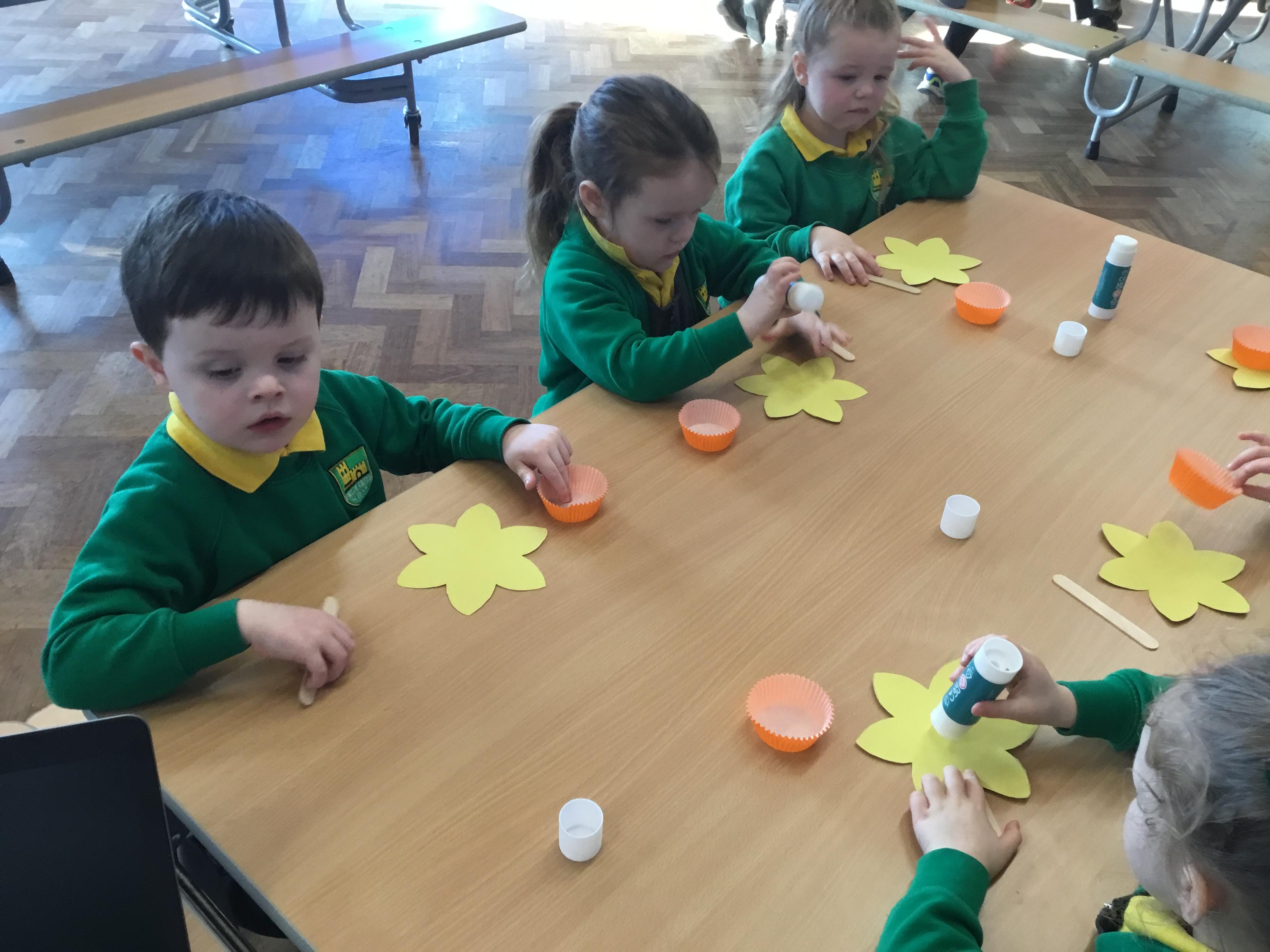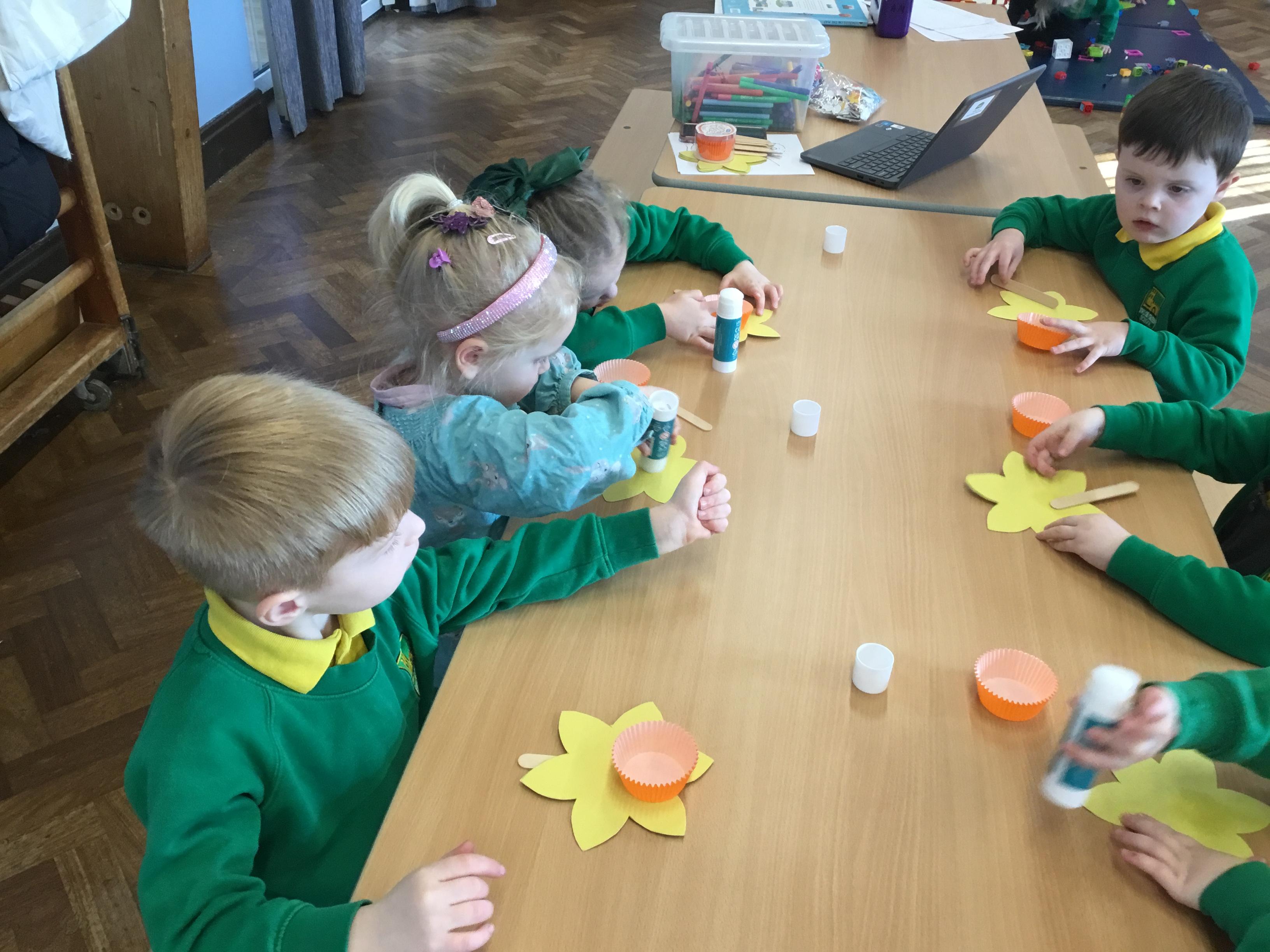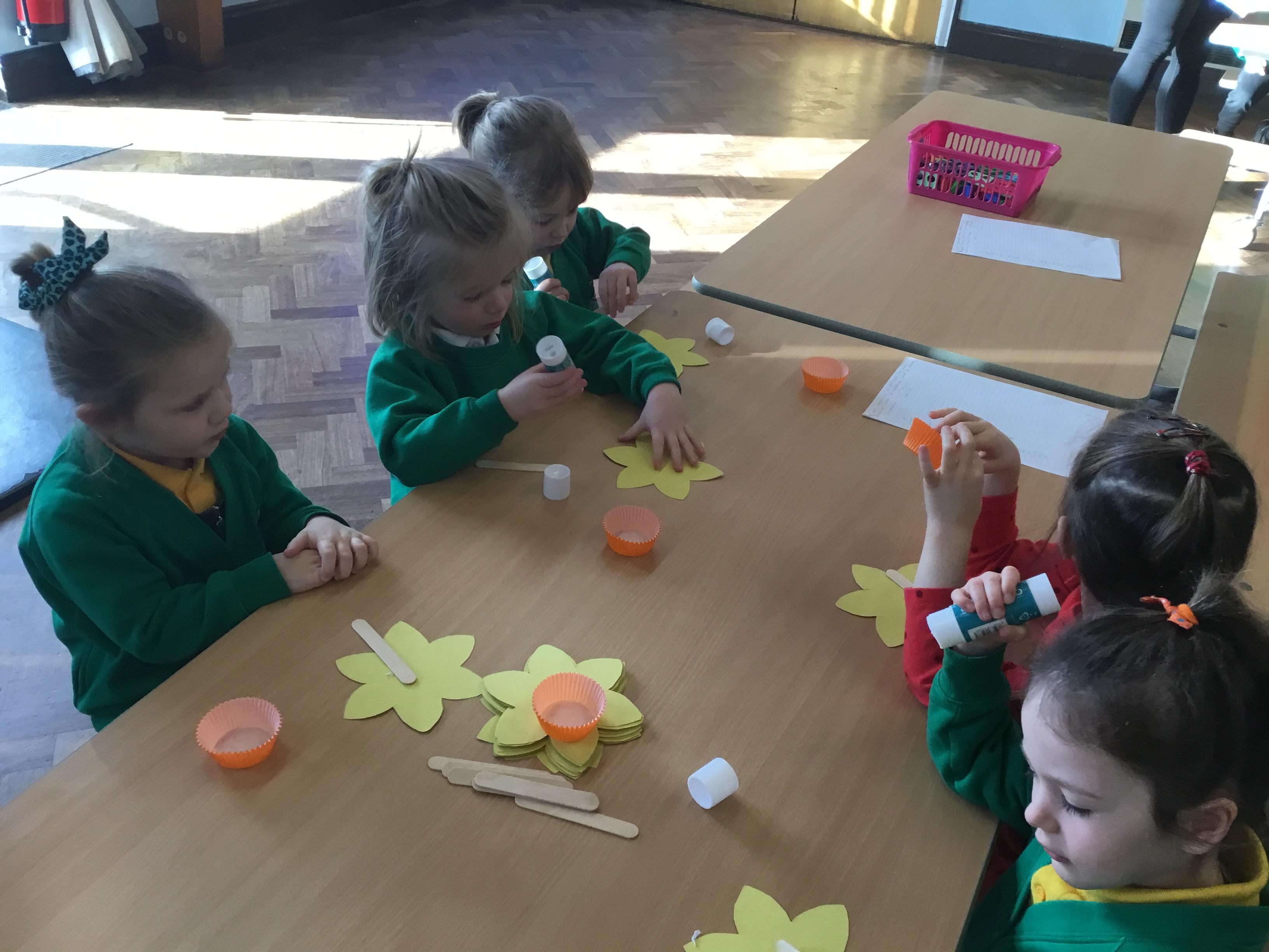 The Children enjoying their first week back. They have enjoyed learning and exploring about St David and Wales. We have been making Welsh cakes, looking at maps and where we live, making Daffodils and drawing Dragons.