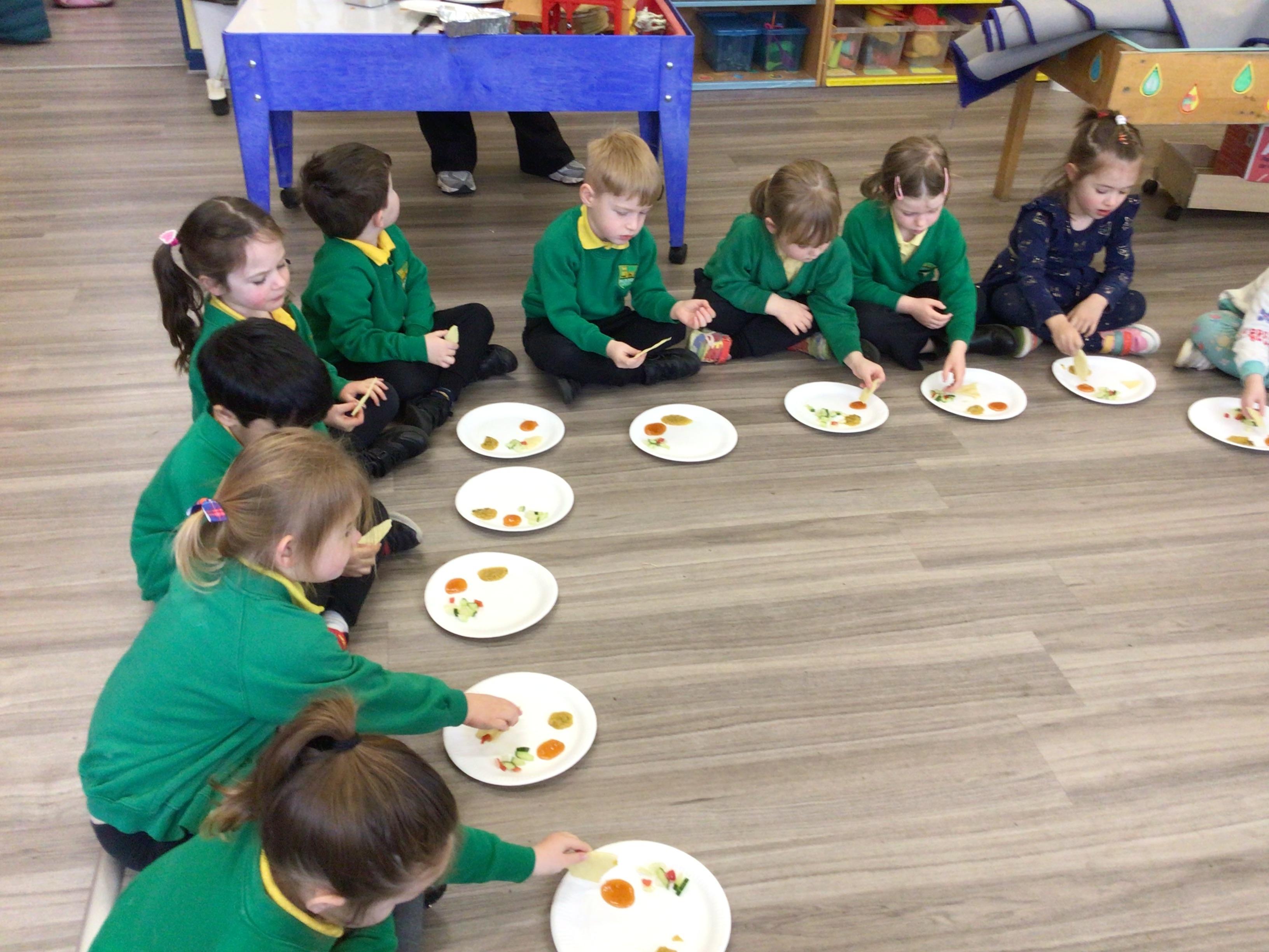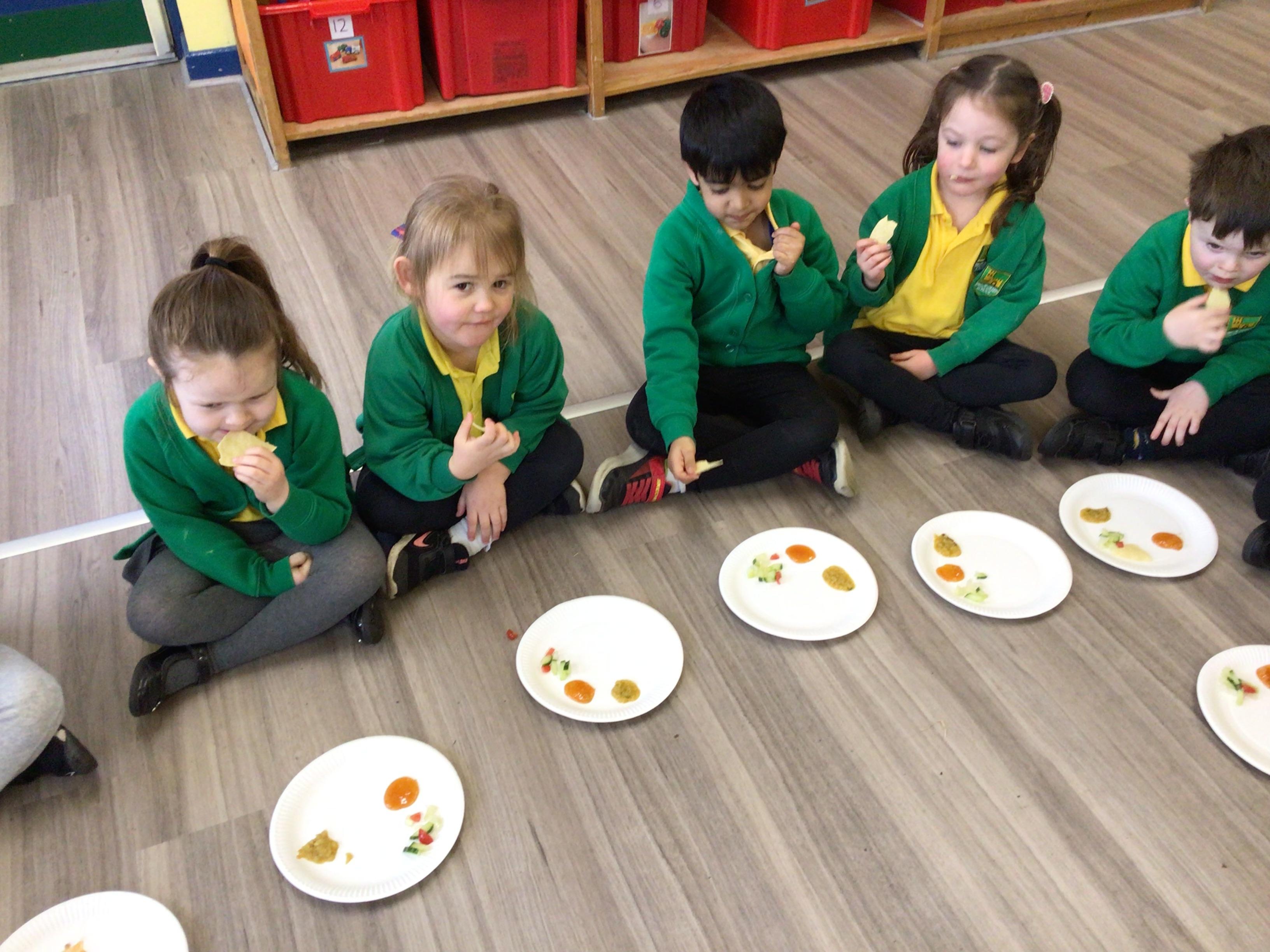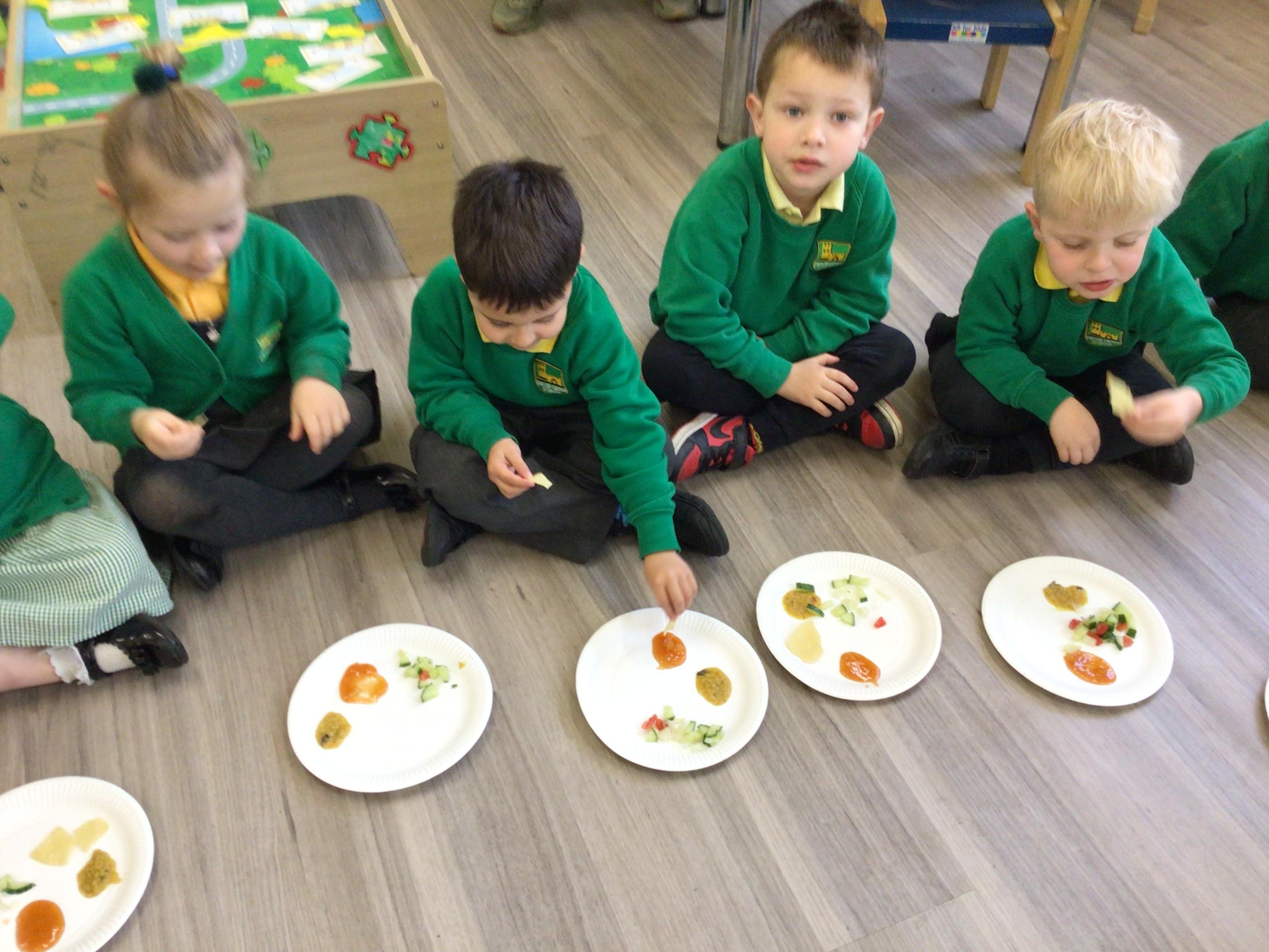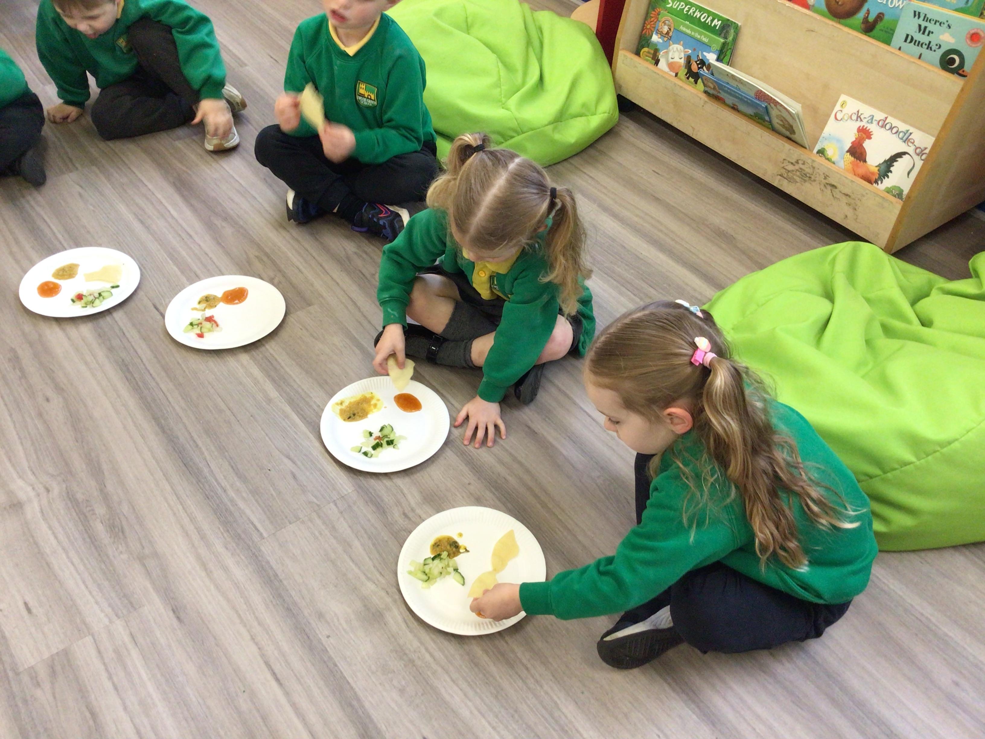 Today we have been food tasting to celebrate Eid. The children really enjoyed tasting the food and all had a try. The children were able to taste Mango chutney, Dahl curry, Poppadums and mint salad.