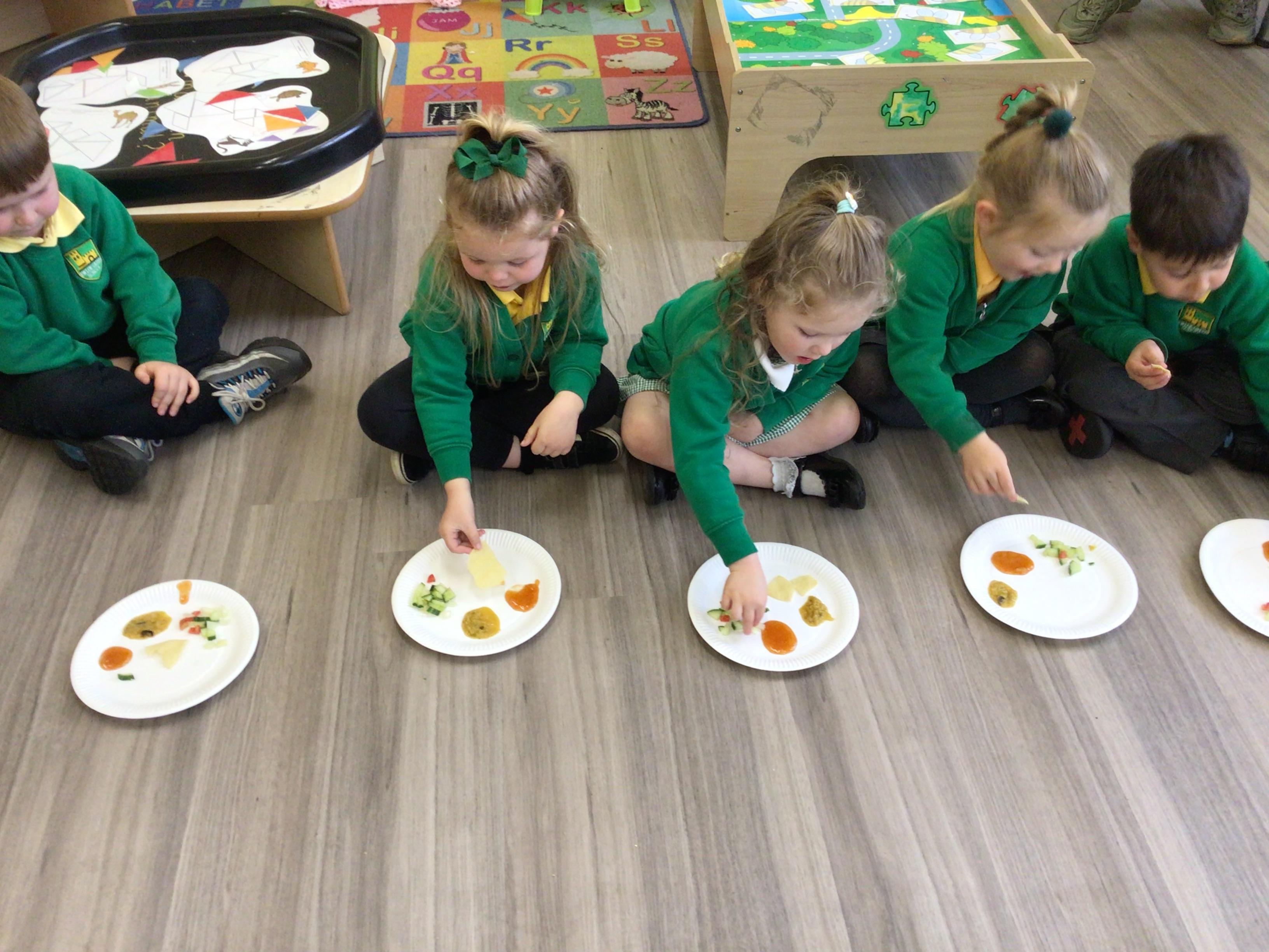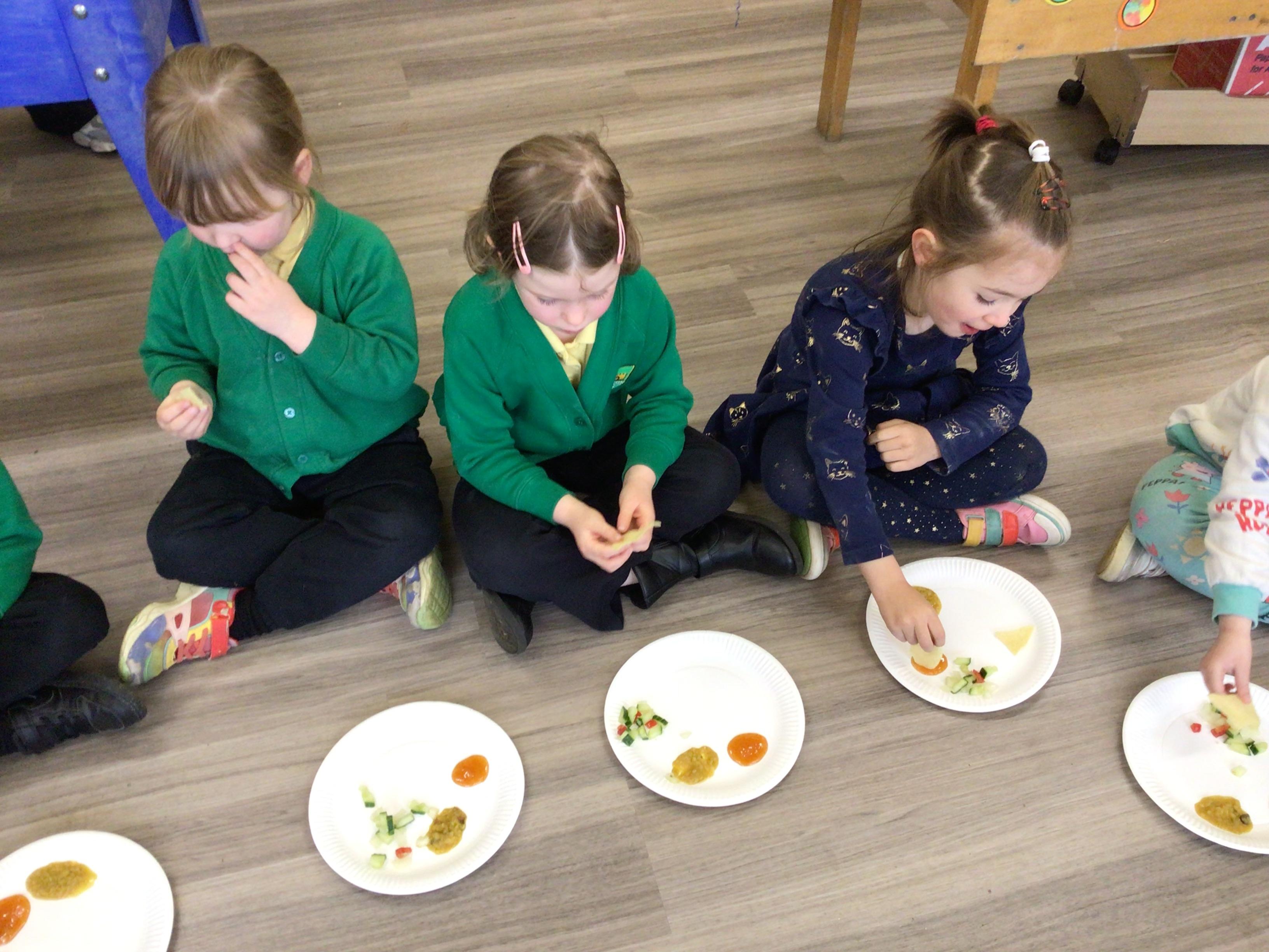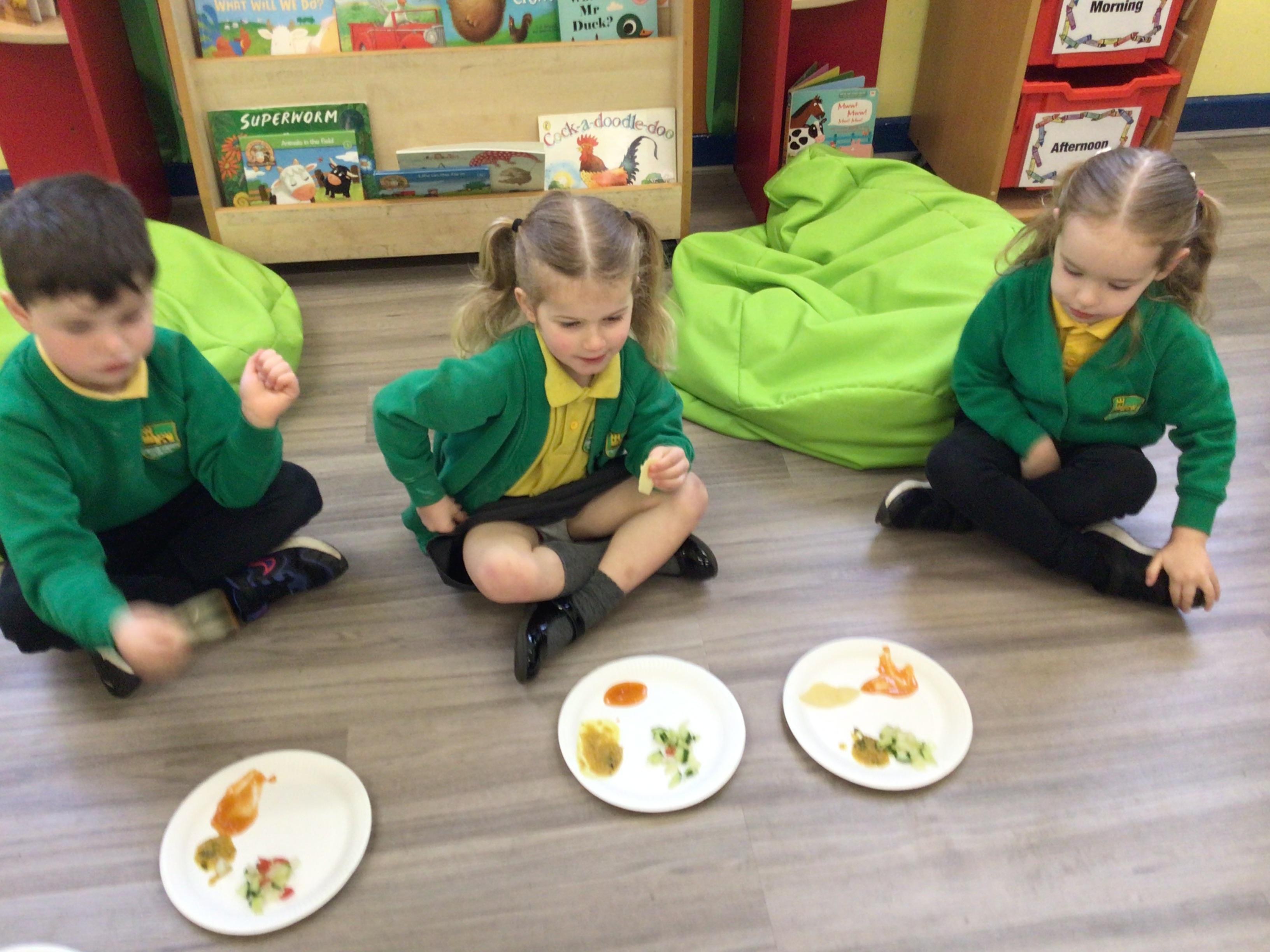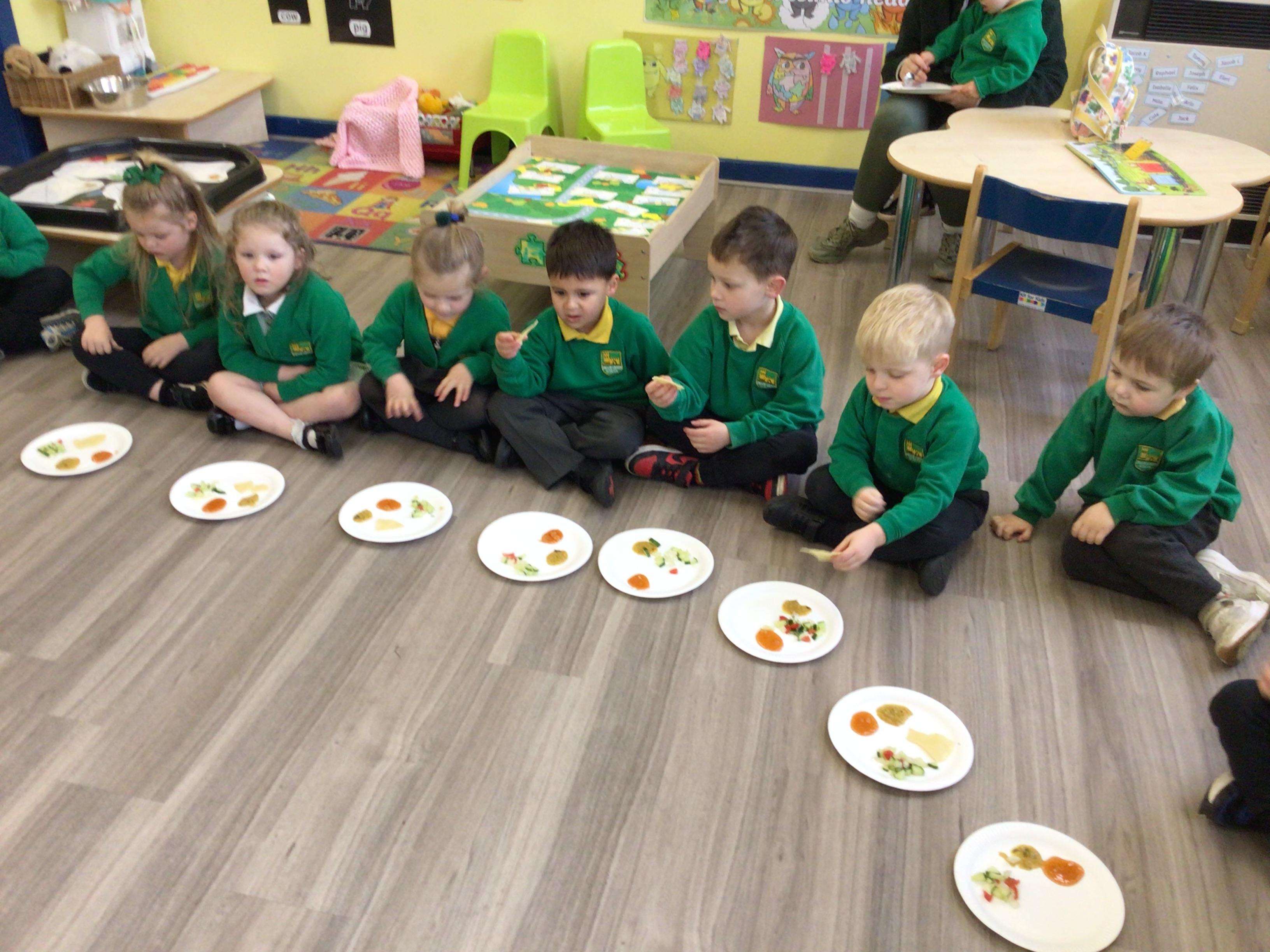 Today we have been food tasting to celebrate Eid. The children really enjoyed tasting the food and all had a try. The children were able to taste Mango chutney, Dahl curry, Poppadums and mint salad.