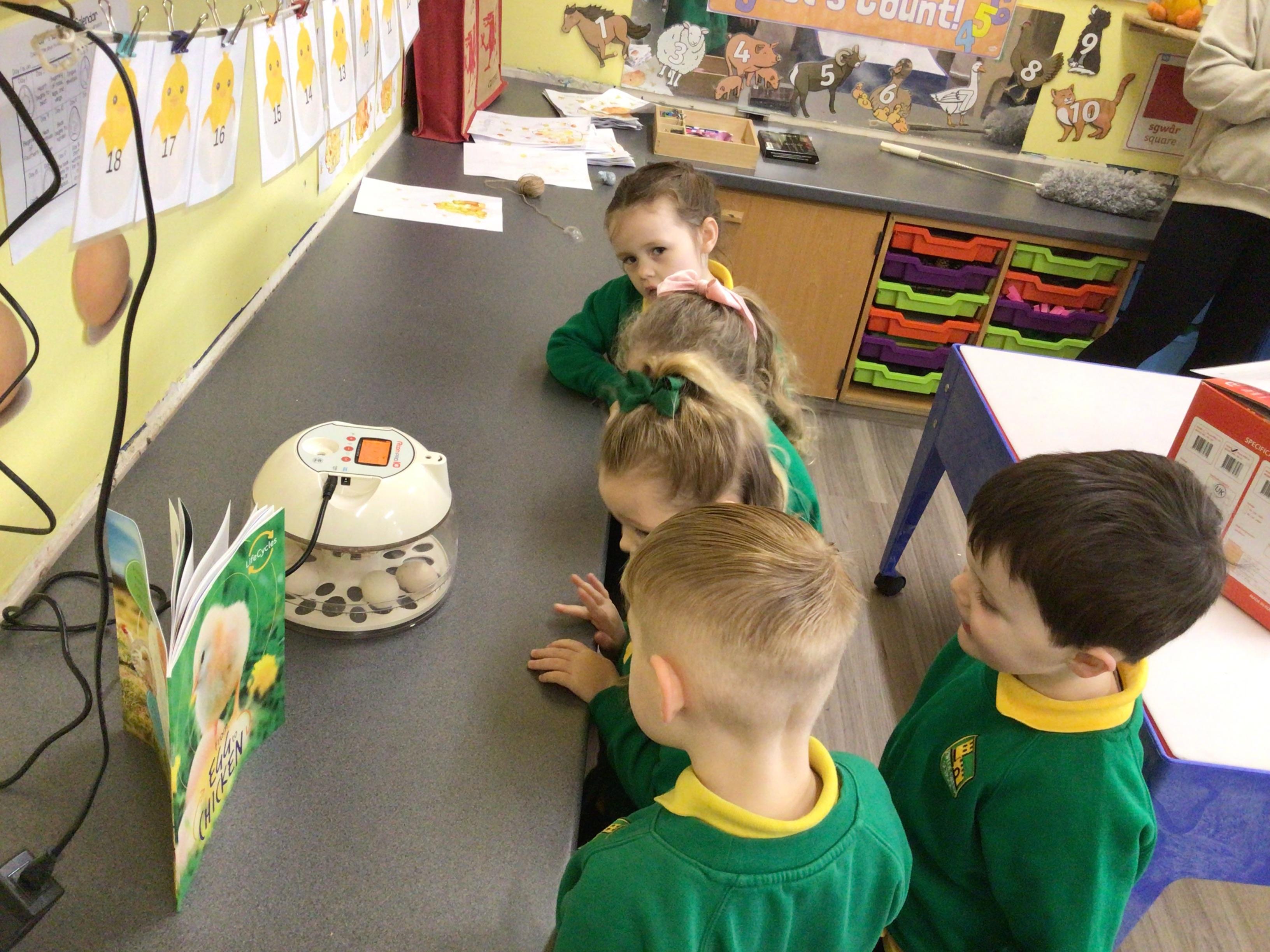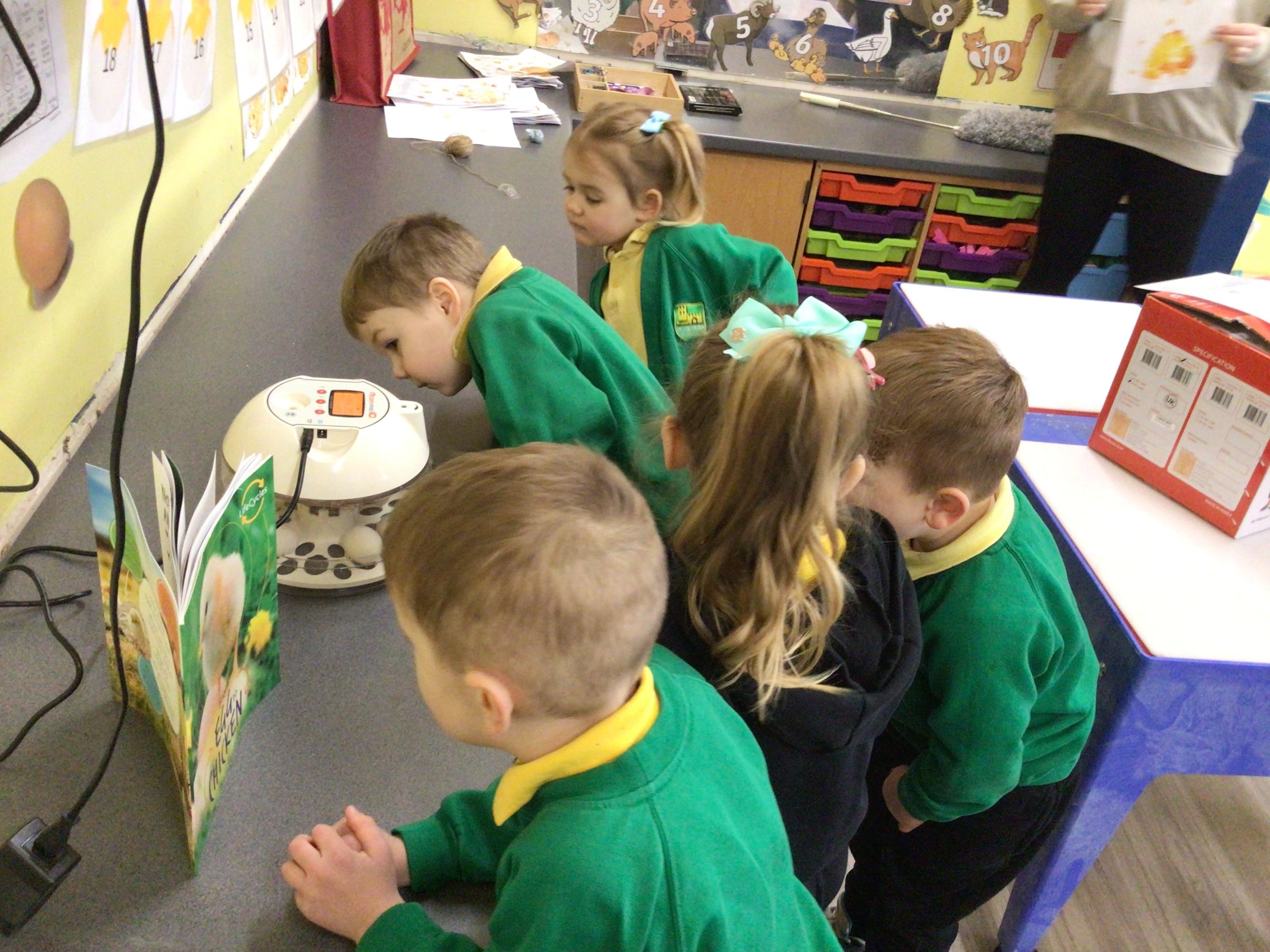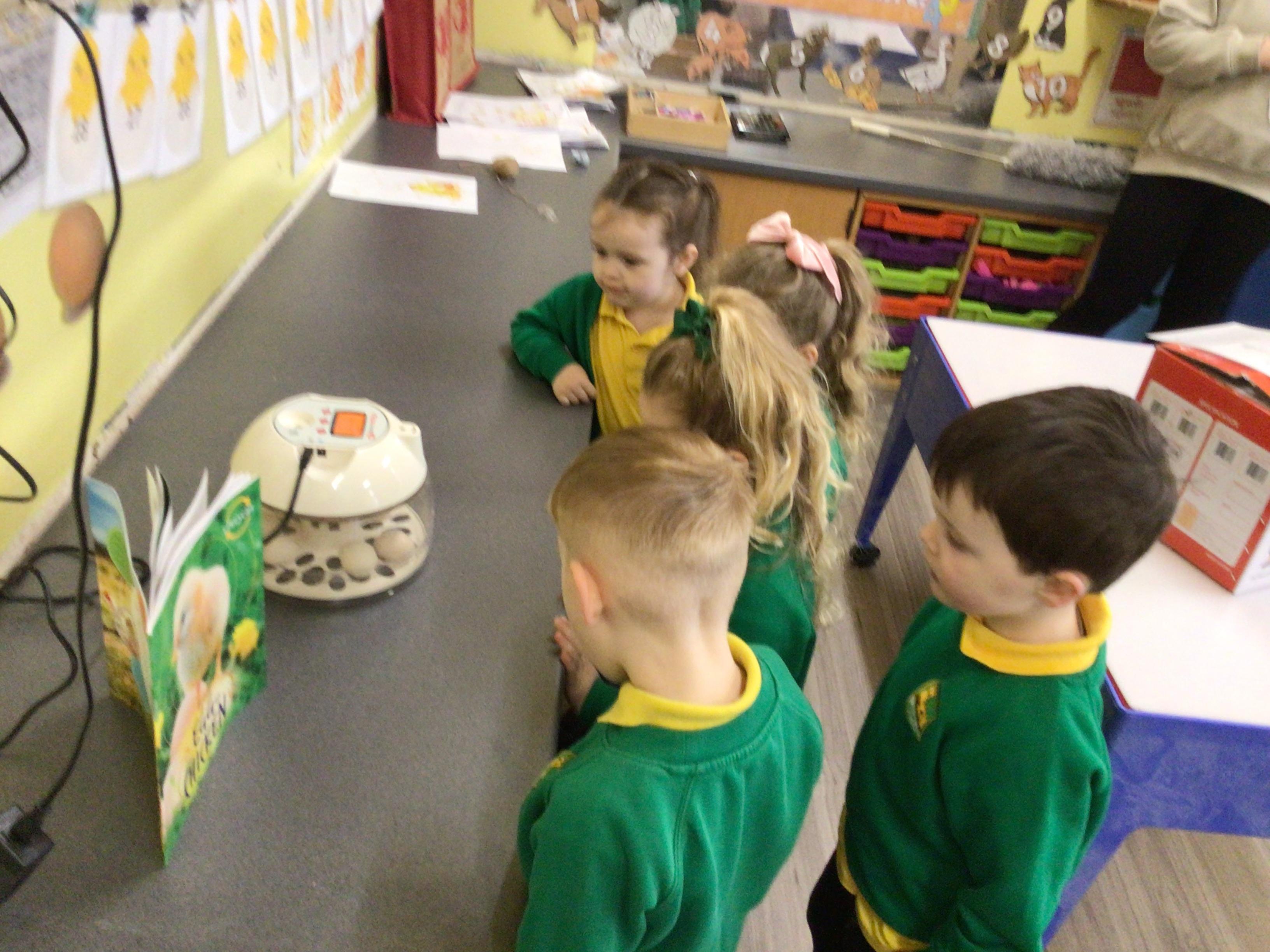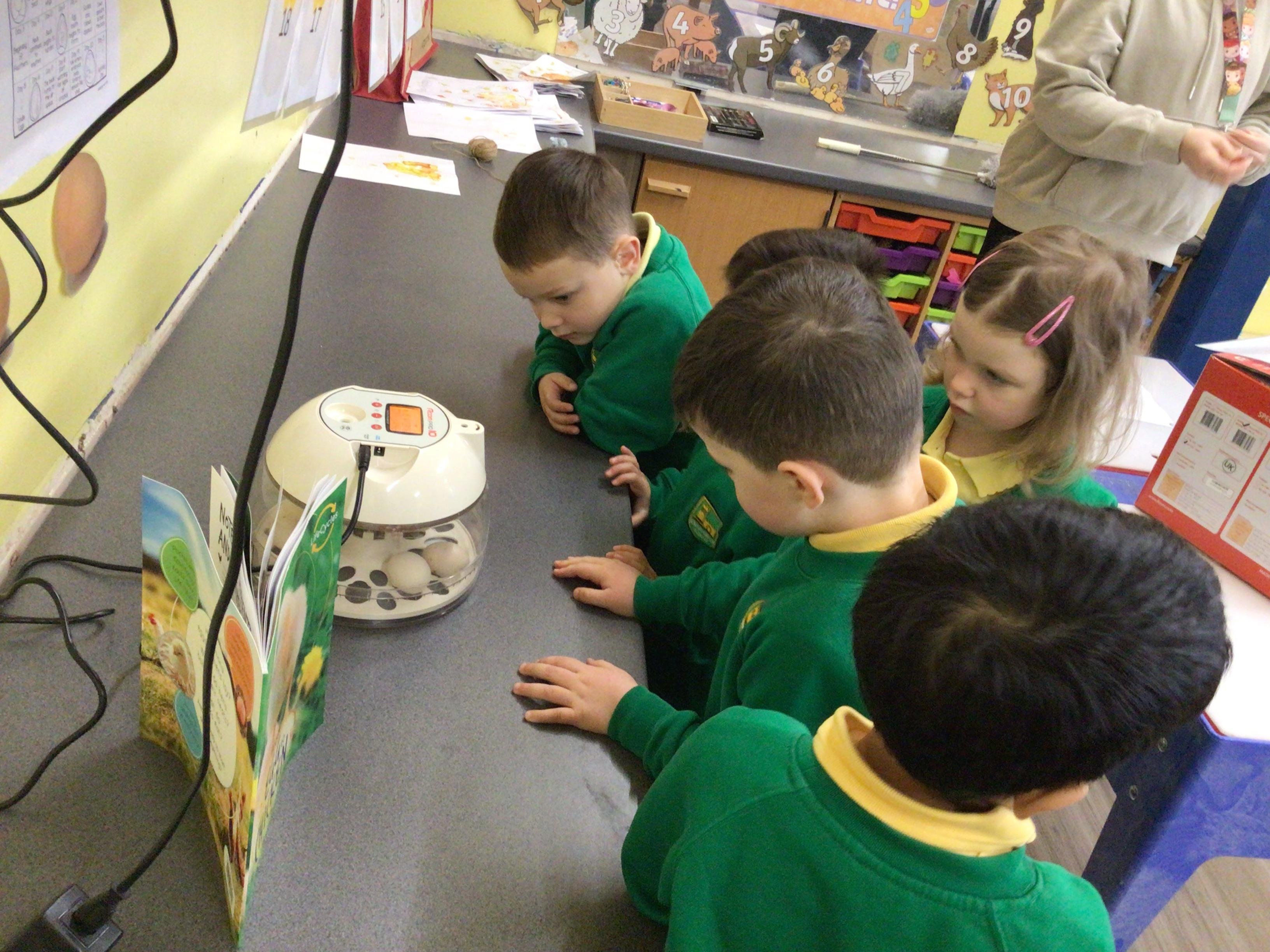We have something really eggciting happening in Nursery. We have eggs which are hopefully going to hatch into chicks. The children will be watching what happens during the next couple of weeks.