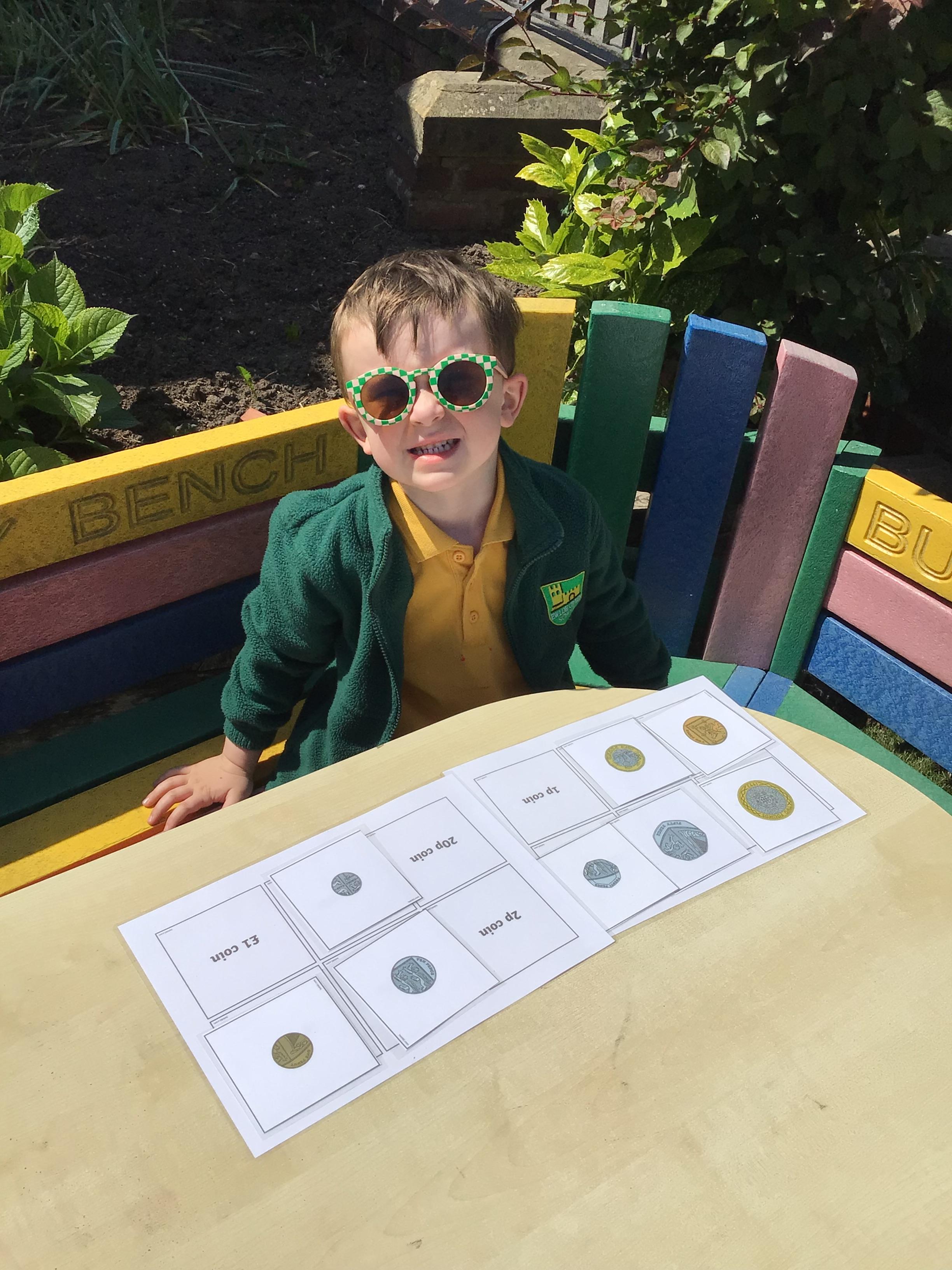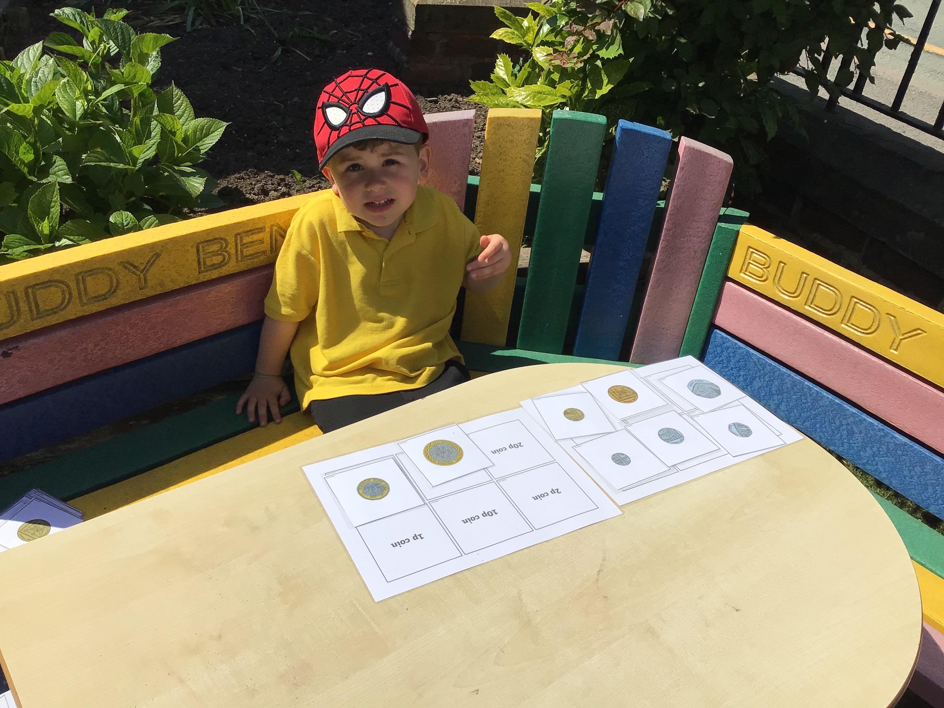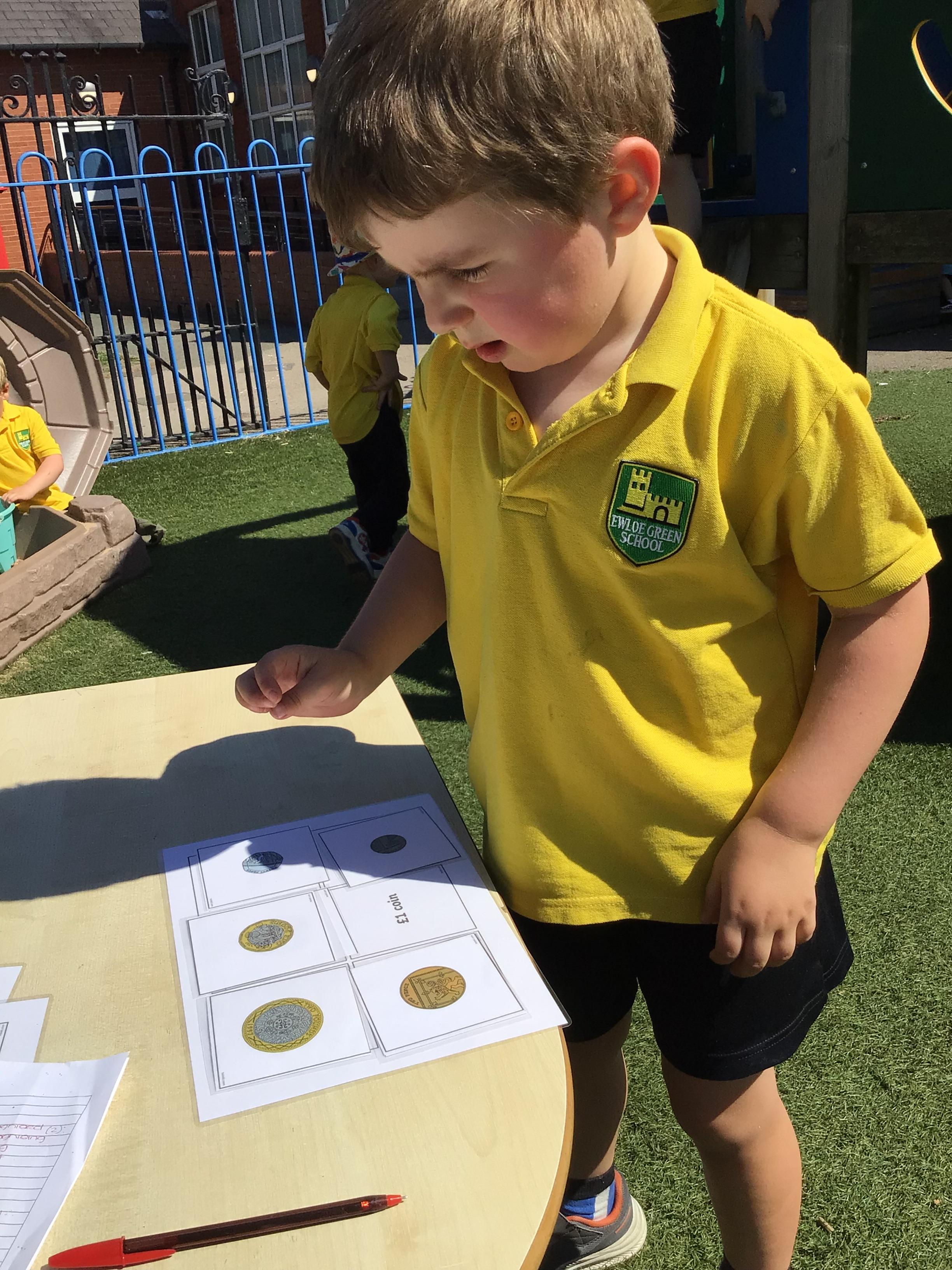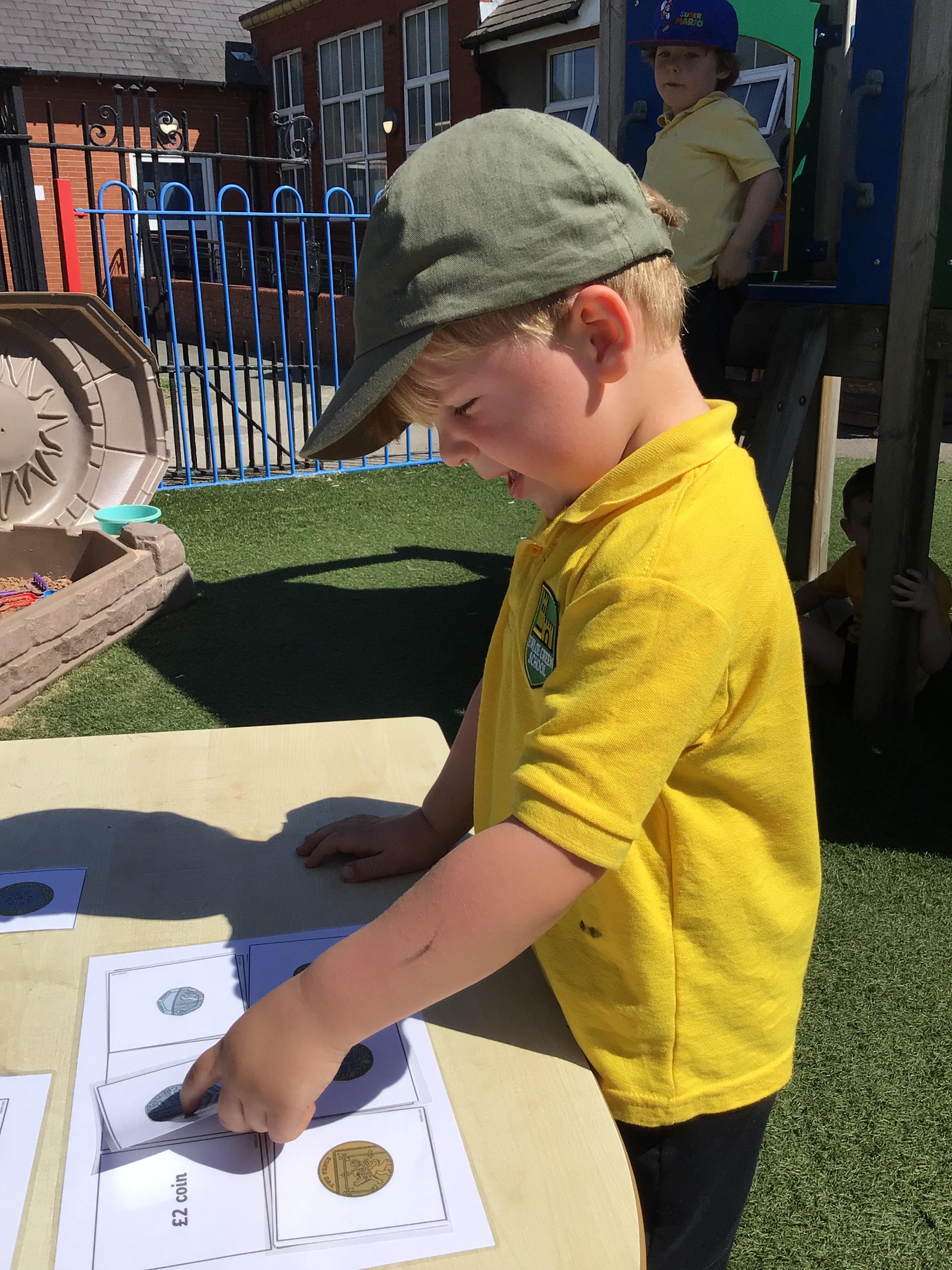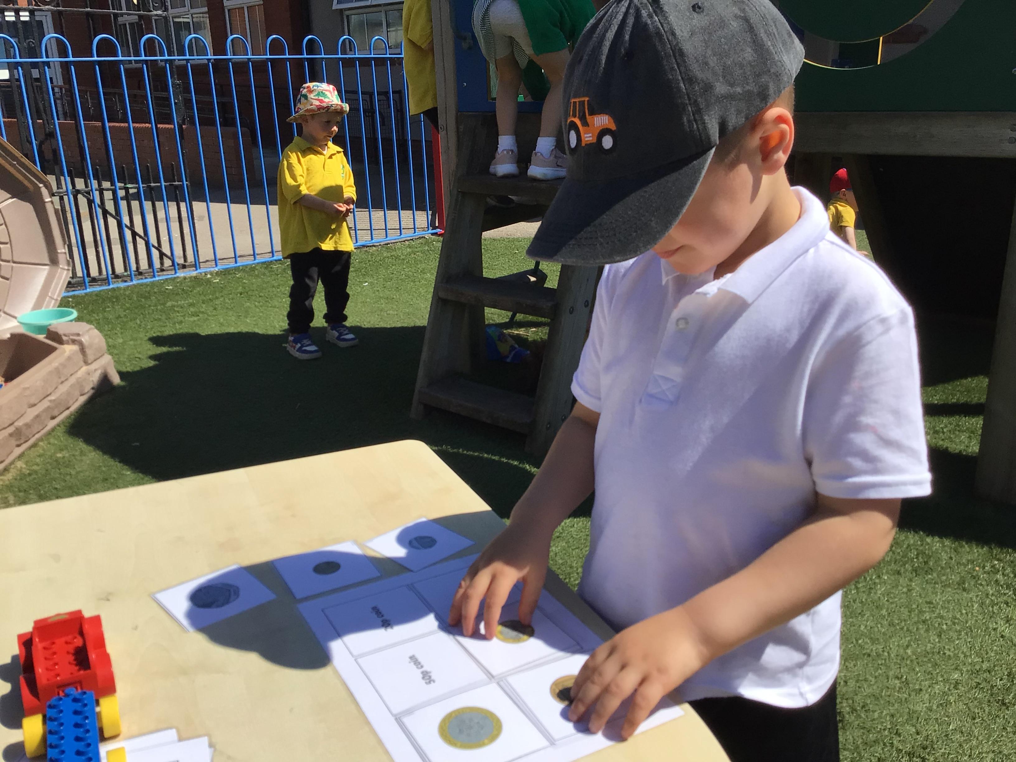 We have had a fantastic week, being outside doing our activities. This week the children have been learning about money, making petal play dough , creating a garden display and ordering beanstalks.