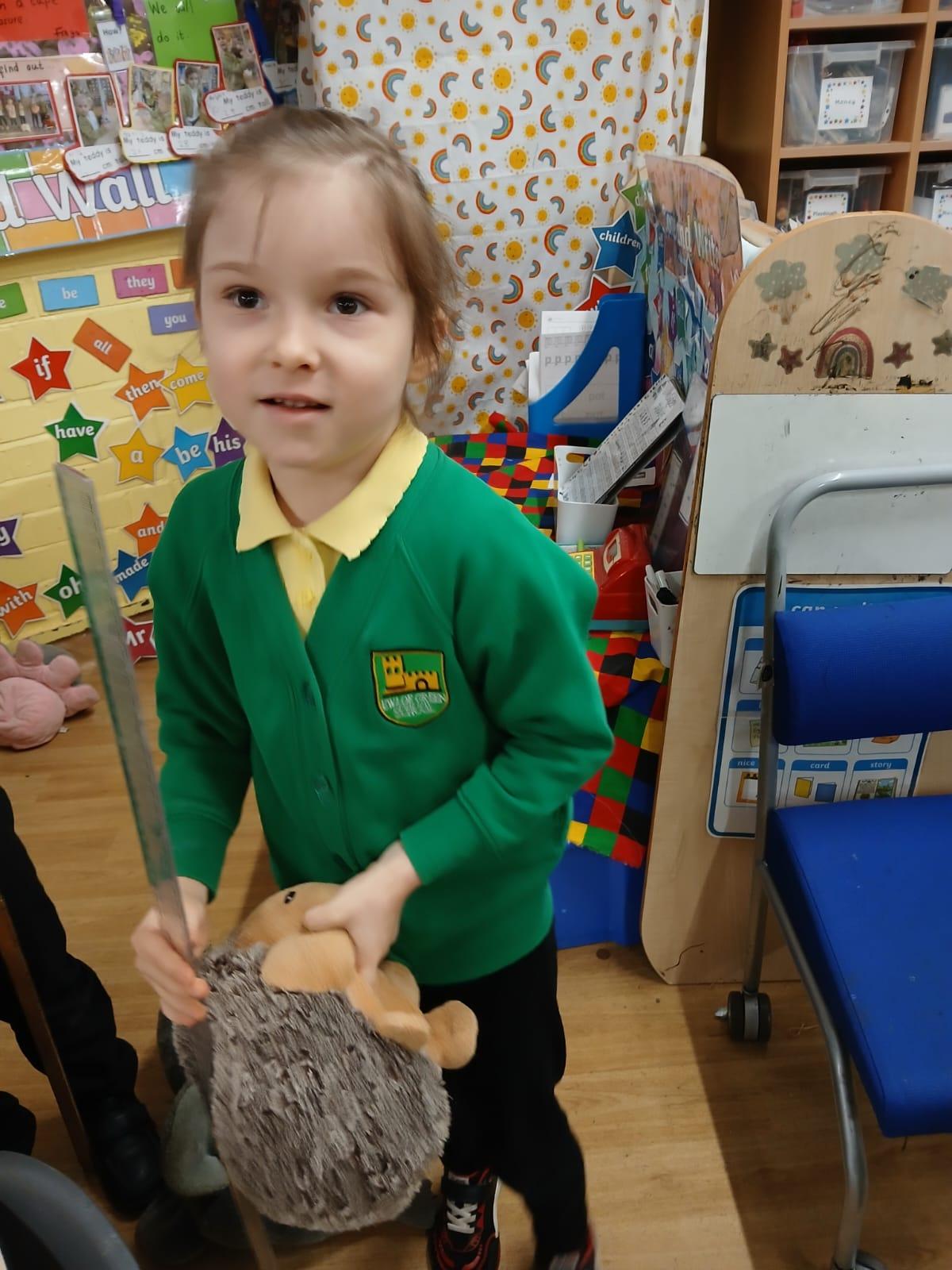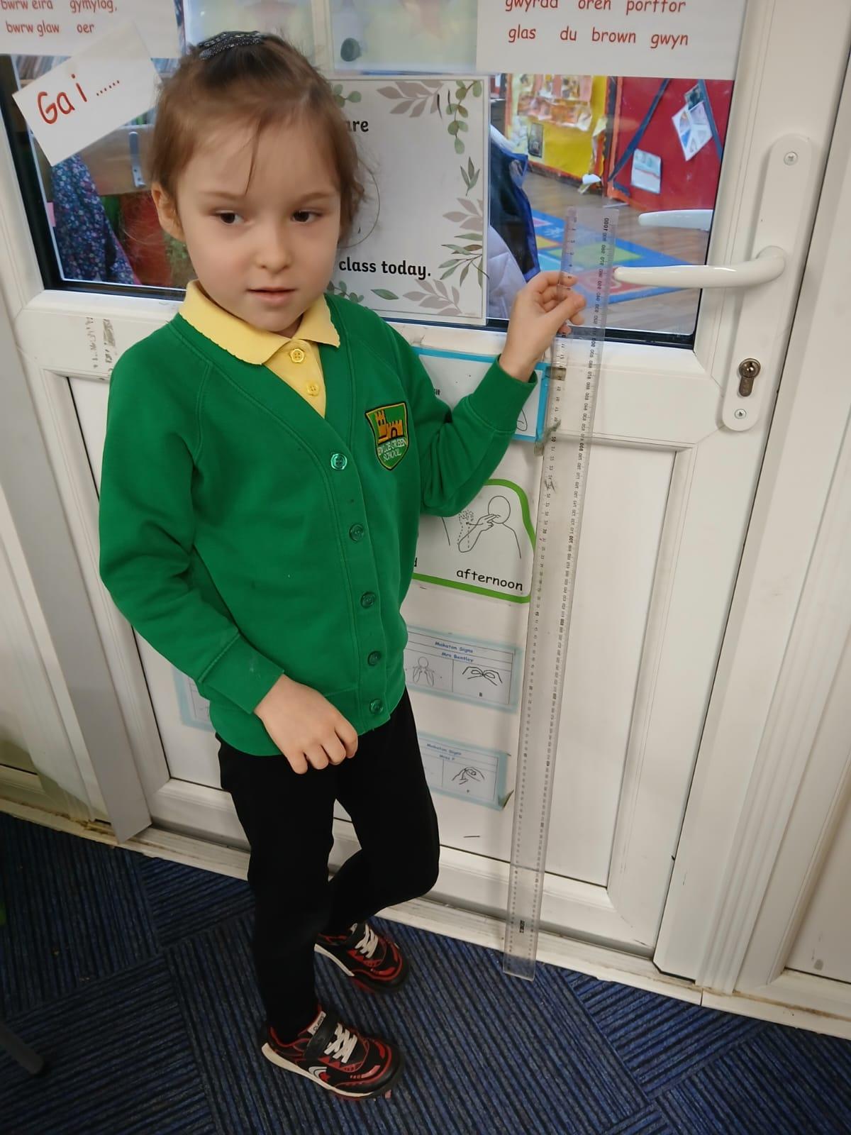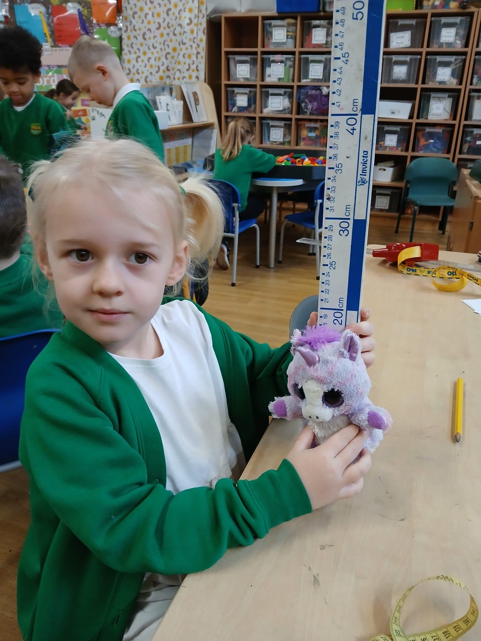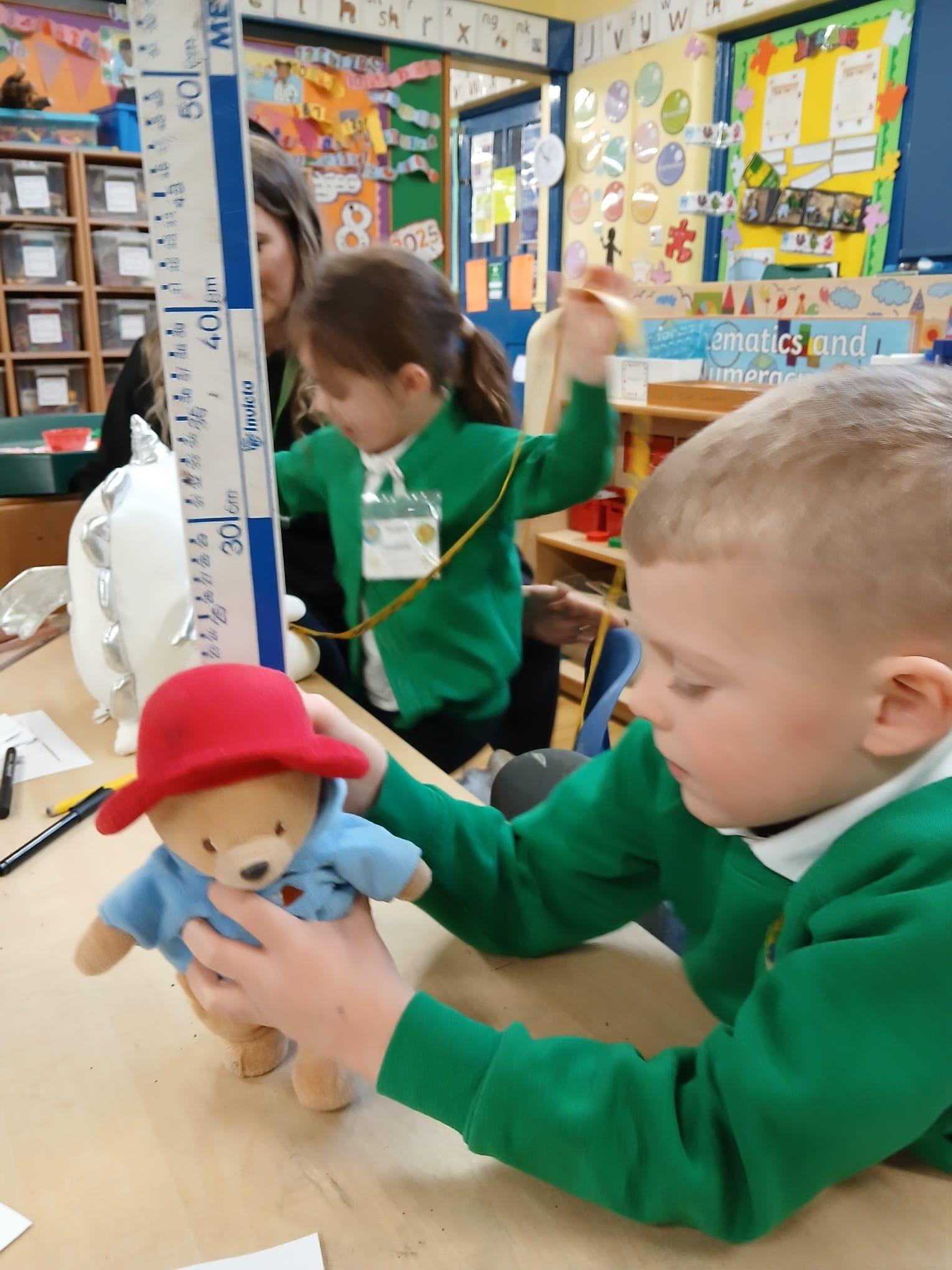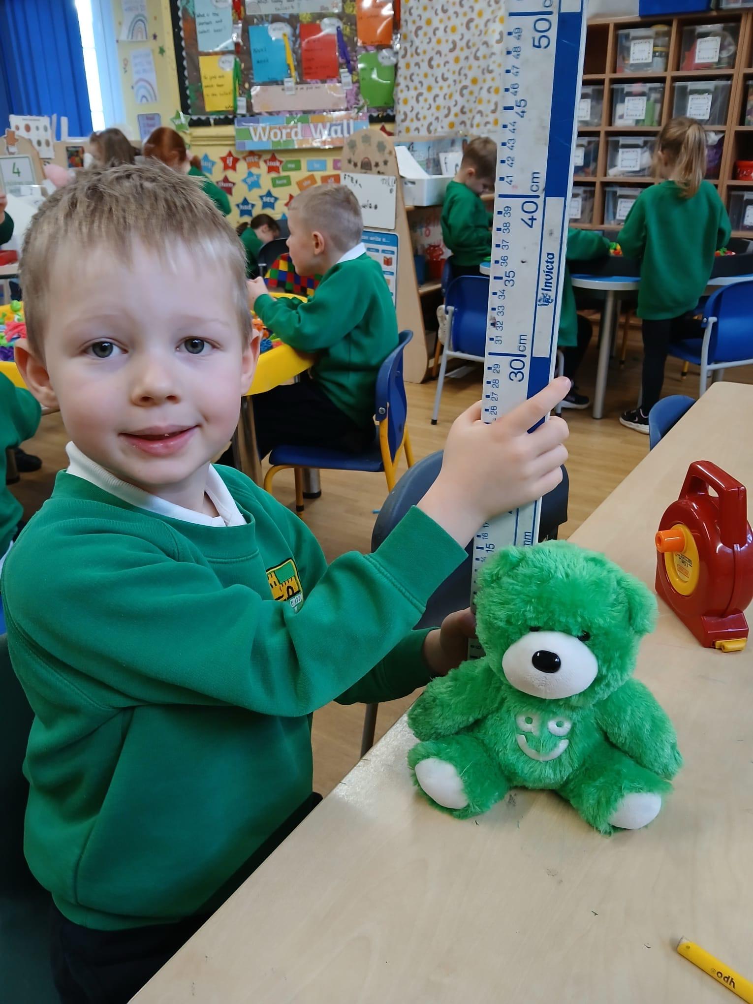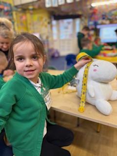 We wanted to find out which Teddy was the tallest. We all wanted to use a tape measure to measure their height. We learnt that we use centimetres to measure but can write cm when we record measurements.