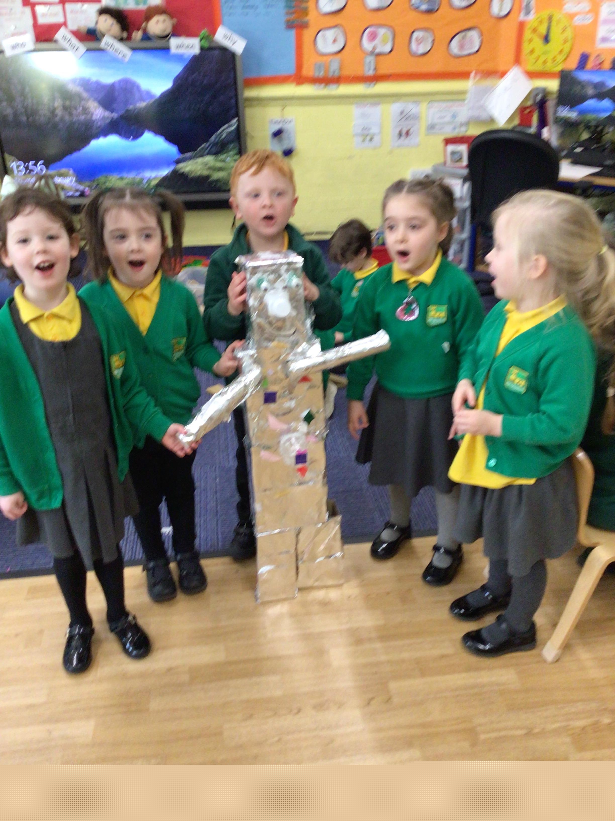 This week we are reading the story "Harry and The Robots" and thinking what we could do to make nan feel better. Our letter of the week is h/H and we will be writing 3 letter words starting with h. In maths we are using a programmable toy to discuss directions, using an app to plot a bar chart and making a marble run using playdough. This week we are also looking at birds, moving like robots in p.e. and doing preparation for our assembly on Thursday. It's about being unique and you may hear the children singing "I Am the One and Only" by Chesney Hawkes. We also want to know what your child's favourite piece of music is so we can listen to everyone's choice in class over the next couple of weeks.